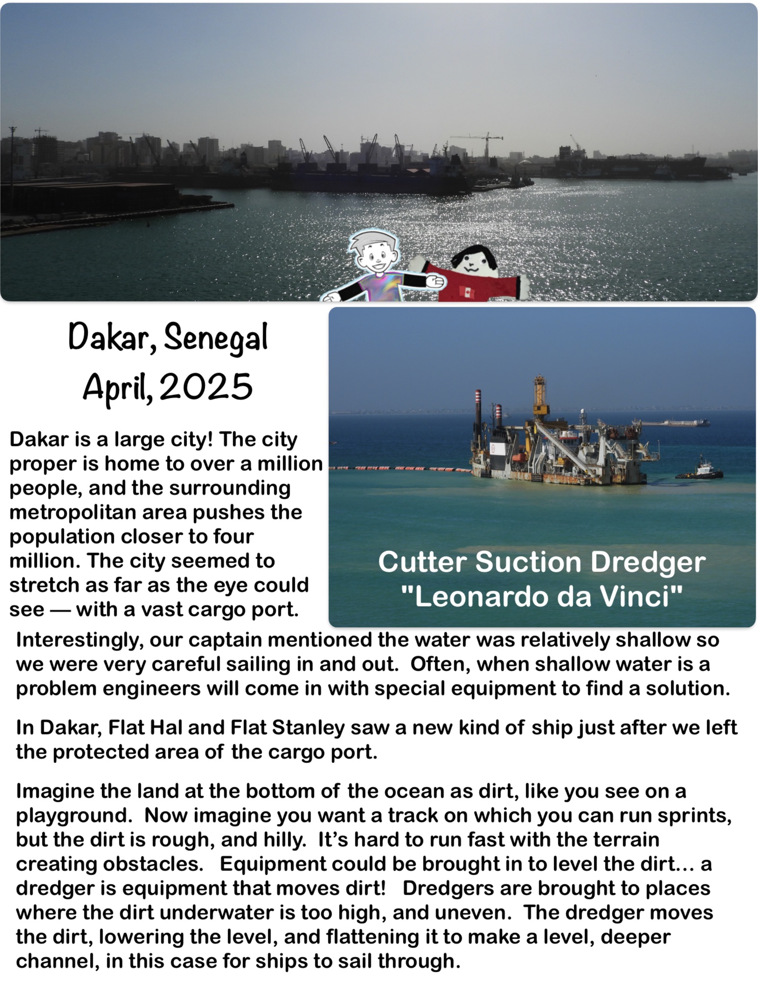 In Dakar, Flat Hal and Flat Stanley saw a new kind of ship just after we left the protected area of the cargo port.
