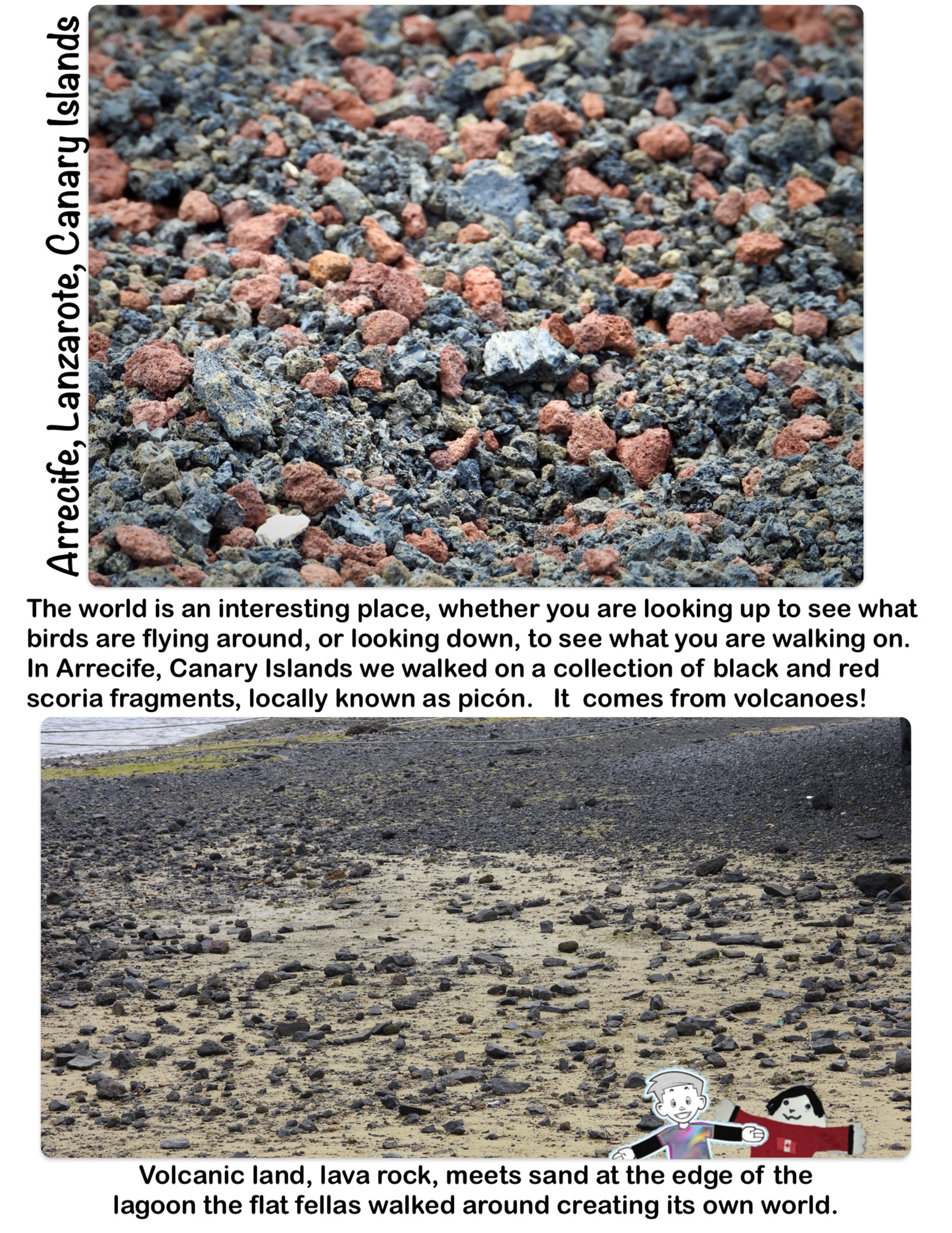 The world is an interesting place, whether you are looking up to see what birds are flying around, or looking down, to see what you are walking on. In Arrecife, Canary Islands we walked on a collection of black and red scoria fragments, locally known as picón. It comes from volcanoes!
