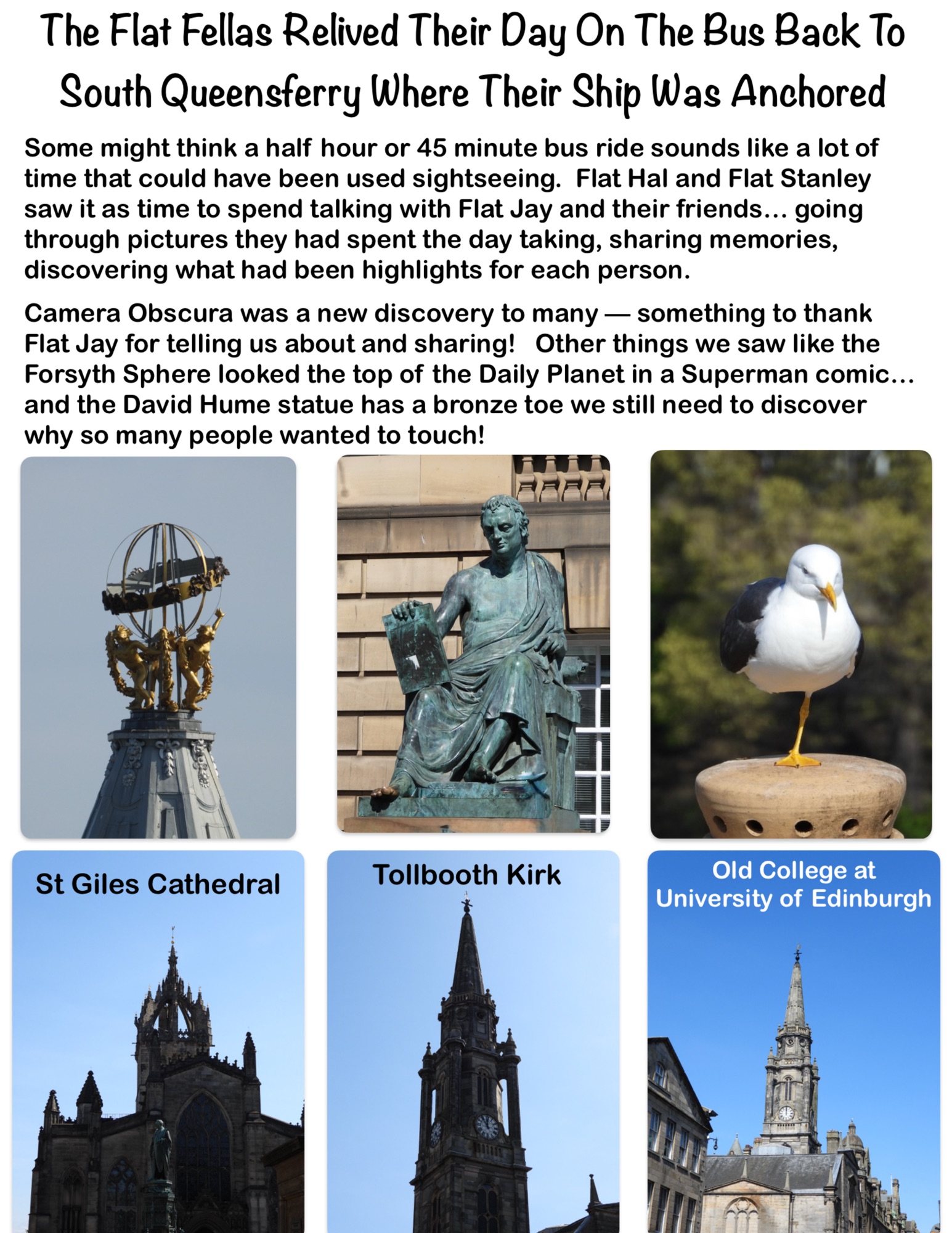 Some might think a half hour or 45 minute bus ride sounds like a lot of time that could have been used sightseeing. Flat Hal and Flat Stanley saw it as time to spend talking with Flat Jay and their friends… going through pictures they had spent the day taking, sharing memories, discovering what had been highlights for each person.