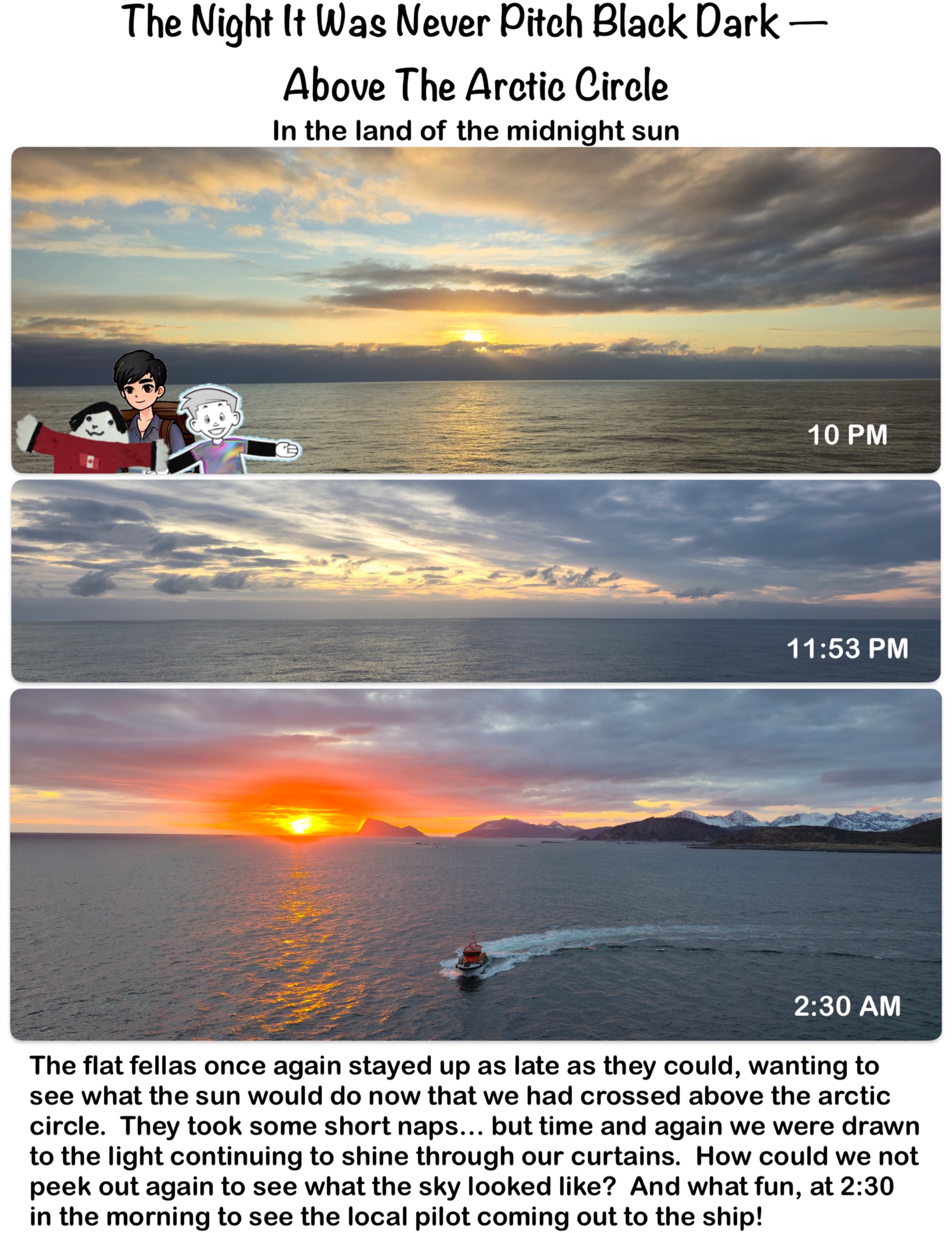 The flat fellas once again stayed up as late as they could, wanting to see what the sun would do now that we had crossed above the arctic circle. They took some short naps… but time and again we were drawn to the light continuing to shine through our curtains.