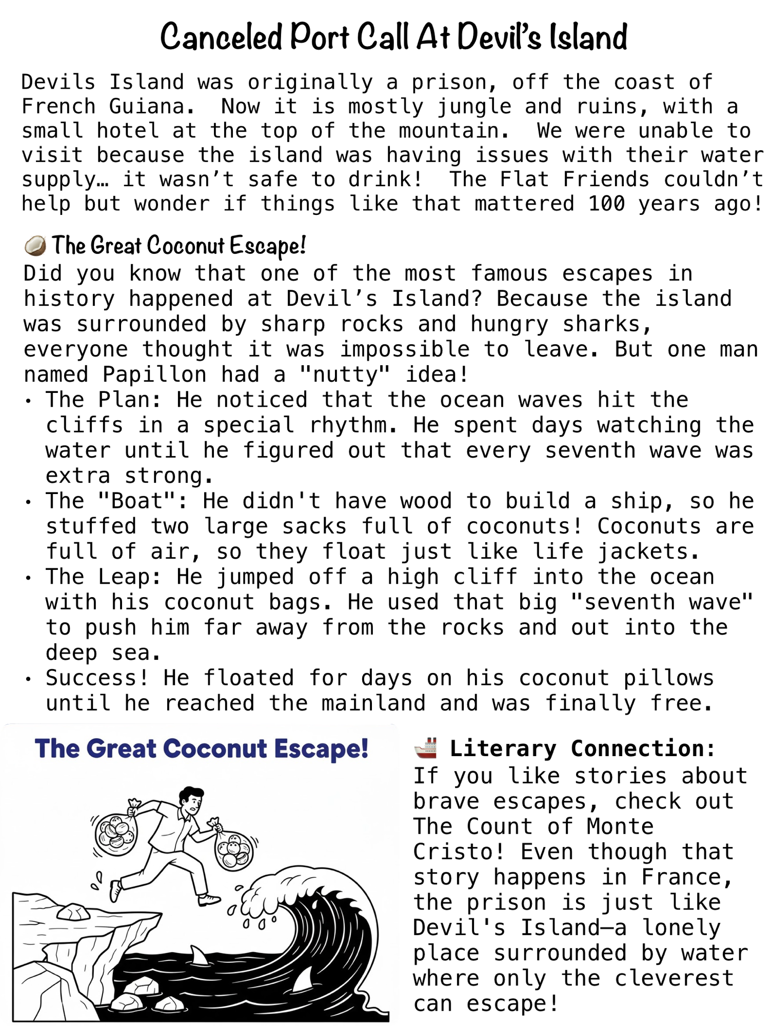 🚢 Literary Connection: If you like stories about brave escapes, check out The Count of Monte Cristo! Even though that story happens in France, the prison is just like Devil’s Island—a lonely place surrounded by water where only the cleverest can escape!
