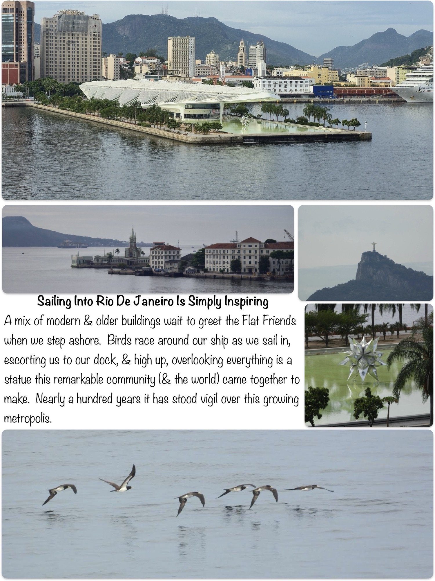 A mix of modern & older buildings wait to greet the Flat Friends when we step ashore. Birds race around our ship as we sail in, escorting us to our dock, & high up, overlooking everything is a statue this remarkable community (& the world) came together to make. Nearly a hundred years it has stood vigil over this growing metropolis.