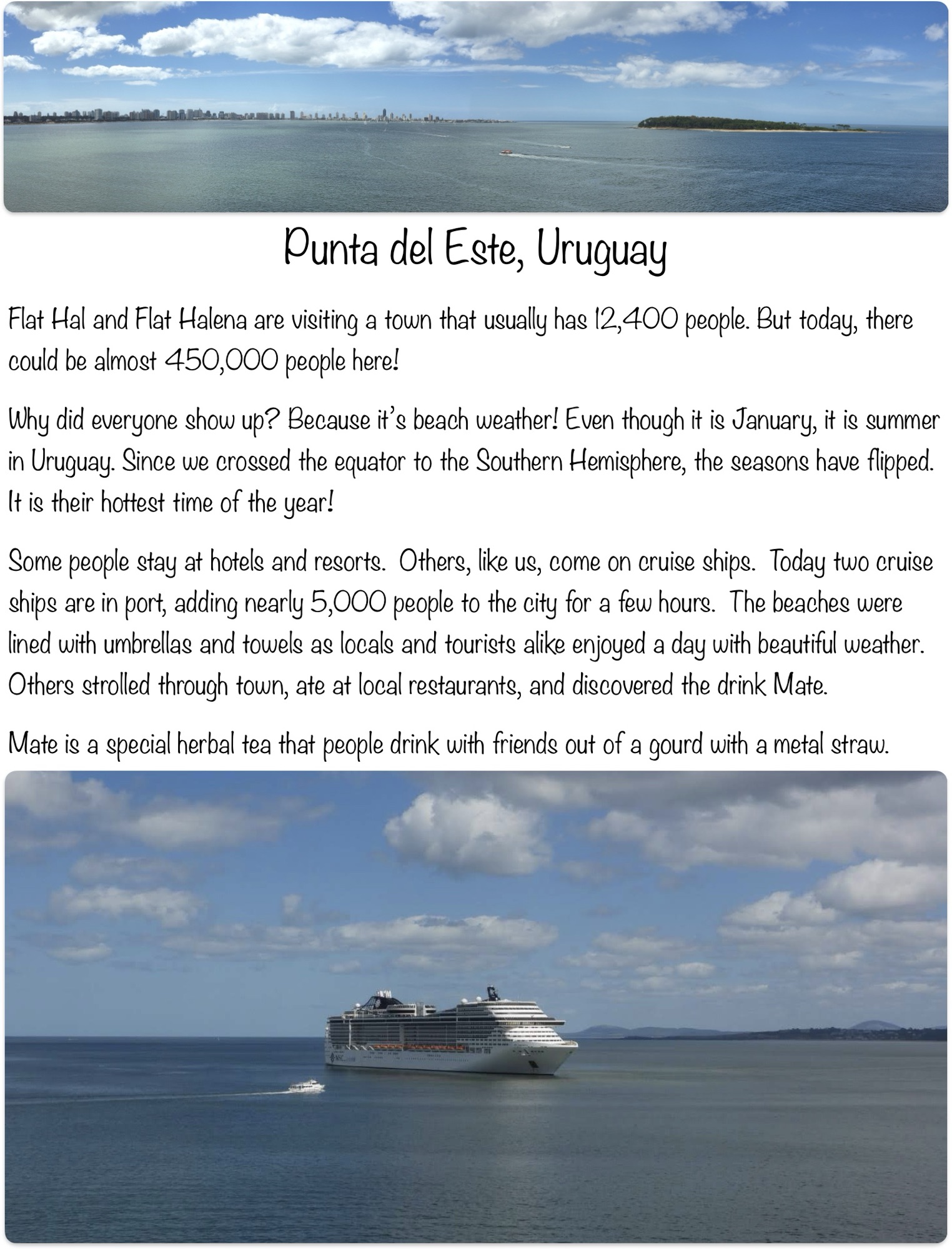 Some people stay at hotels and resorts. Others, like us, come on cruise ships. Today two cruise ships are in port, adding nearly 5,000 people to the city for a few hours. The beaches were lined with umbrellas and towels as locals and tourists alike enjoyed a day with beautiful weather. Others strolled through town, ate at local restaurants, and discovered the drink Mate.